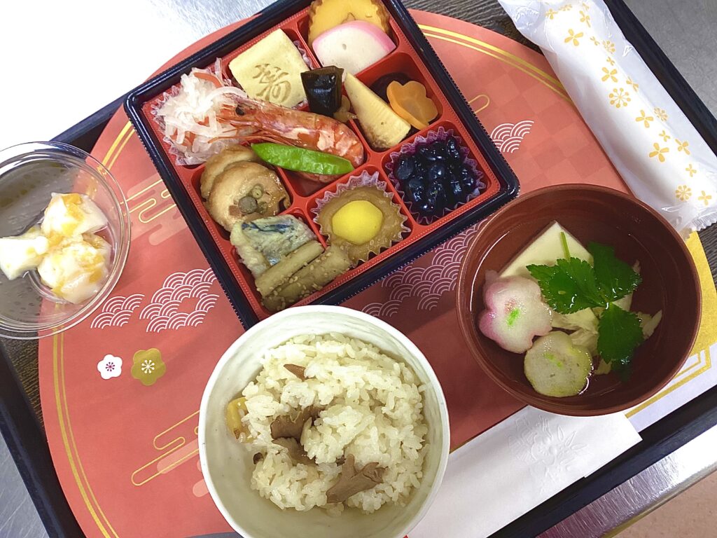 おせちもありますよ~‼️ 他にもデザート、キノコと栗ごはんにお吸い物‼️
